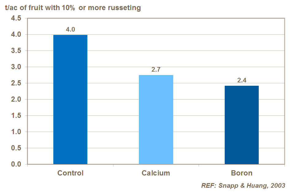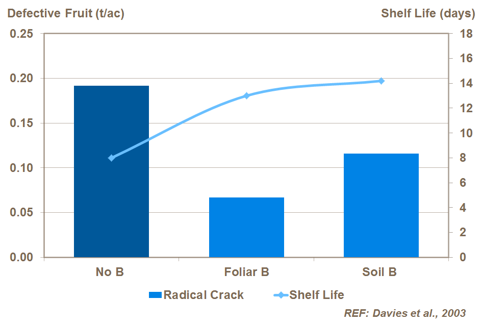ABD’de yapılan denemenin gösterdiği gibi, borun meyvenin çatlama ve raf ömrü üzerinde de olumlu bir etkisi vardır. Meyve omzundaki çatlaklar su kaybını ve patojen saldırısına karşı duyarlılığı artırır.