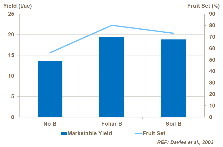 Bor ayrıca polen çimlenmesi ve meyve tutumunda önemli bir role sahiptir, bu nedenle, ABD’de yapılan çalışmalarda gösterildiği gibi, bor beslenmesi verimi etkiler.