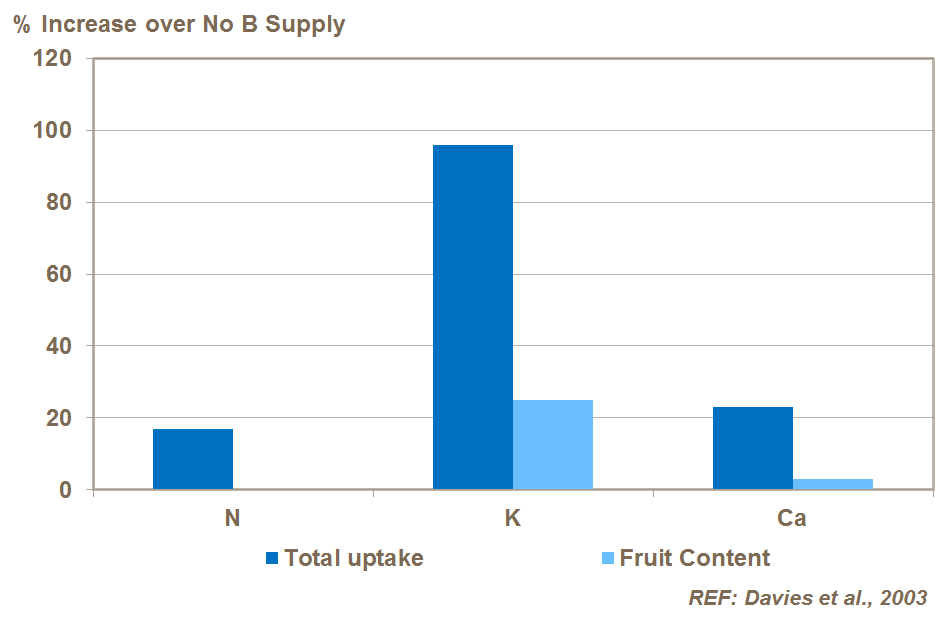 ABD’de yapılan deneme, bor eksikliği varsa, özellikle azot, potasyum ve kalsiyum gibi diğer besin maddelerinin alımının azaldığını göstermektedir.