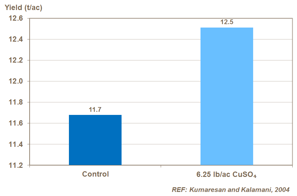 Bakır sülfatın yetersiz topraklara bazal uygulamaları, Hindistan'daki denemede gösterildiği gibi, bitki büyümesini ve bunun sonucunda verimi arttırır.